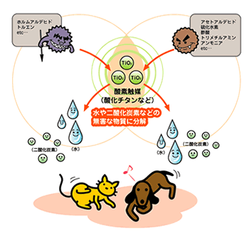 イヌやネコたちの臭いはもちろん、暮らしのなかの悪臭成分を半永久的に分解・除去します。酸素触媒による分解作用を利用しておりますので、太陽光や蛍光灯下だけでなく、酸素があれば暗所においても十分な消臭効果を発揮します。